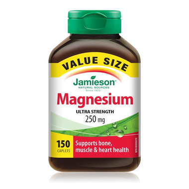 Jamieson Magnesium 250 mg is a high potency, highly absorbable natural complex of three magnesium sources that helps develop and maintain bones and supports muscle function.