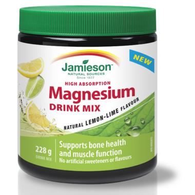 Jamieson Magnesium Drink Mix supports bone health and muscle function.