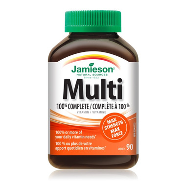 Jamieson Multi 100% Complete Vitamin Max Strength contains 100% or more of your daily required vitamins in 1 caplet! The multivitamin is formulated in accordance with Health Canada’s Recommended Dietary Allowance (RDA) guidelines for daily nutrient and vitamin intake.