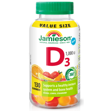 Jamieson Vitamin D3 Gummies 1,000 IU are great tasting, all-natural gummies delivering 1,000 IU of pure, naturally sourced vitamin D3. Vitamin D3 plays a key role in the maintenance of good health. It promotes the development of bones and teeth, helping the body effectively absorb calcium and also supports your immune system.