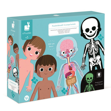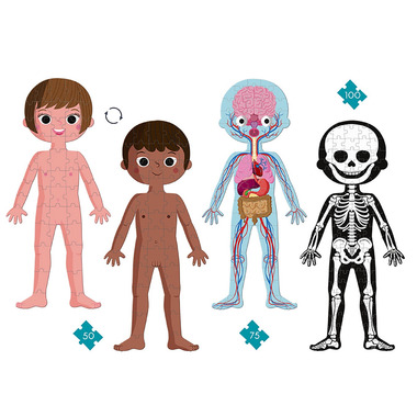 - The set consists of a double-sided 50-piece girl/boy puzzle, a 75-piece puzzle of the organs of the human body and a 100-piece glow-in-the-dark skeleton puzzle.