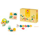 The Janod Box contains: A pull-along turtle toy,  6 wooden fish-shaped threading beads,  a musical awakening stand, a wooden puzzle.