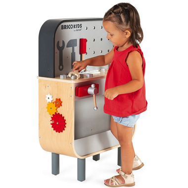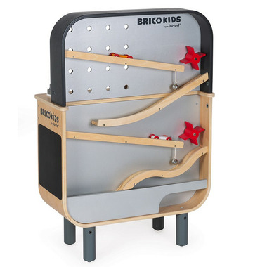 Beautiful bentwood workbench that is played on both sides!!! Front side: a magnetic workbench, complete with a clever system of magnetic tools so that the child stores his tools in the right place, and many accessories to invent objects to assemble and disassemble to infinity, as desired of his imagination. With 3 magnetic tools, 29 accessories (nuts, screws, wooden nails, plates, chalks…), a vice, a gear system and a slate (on the side) to write with the chalks. All the accessories are stored on the front, in the space provided for this purpose. Back side: a 4-lane descender with 2 cars taking turns to slide down the slope by turning the wheels and ringing the bells!! Laughter guaranteed!! For children from 3 to 8 years old. Wooden toy.