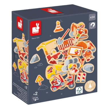 It's construction time here! There's going to be action on every magnetic surface with this set of 24 wooden magnets! Designed for children aged 2 and over, these construction machinery magnets will find their place on the fridge or on the little ones' chalkboards, for even crazier constructions. Fun machine magnets, signaling equipment and a whole team of builders are all part of this set of magnets for kids.
