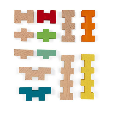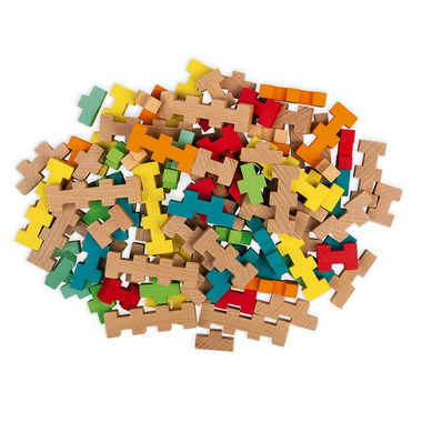 Calling all construction enthusiasts! This set is ideal for giving your imagination free reign. Build planes, robots or giant buildings in a clever way, simply by slotting the pieces together. With its 100 solid wood pieces, cut to different shapes and in 7 different colours, children aged 6 and over can use this set to build almost anything! There are 14 templates included in the barrel to inspire the most creative of builders, whether they're working in 2D or three dimensions! This set is compatible with the 60-piece set (J08300), so you can combine the two to make an even bigger set. This activity is ideal for developing imagination and spatial awareness. The set includes 100 building blocks and 8 double-sided template cards. The Barrel packaging is super convenient for storing all the pieces once you're finished playing with them. Water-based paint. The pieces measure 7 x 1 x 2 cm. FSC®-certified cardboard from sustainably managed forests.