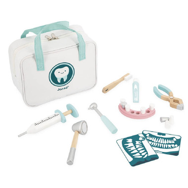 - Includes: pliers, a syringe for anaesthesia, dentures with 8 removable teeth, a dental mirror to find the slightest cavity, a drill, a tube of toothpaste and a toothbrush, so that the patient can leave with his little samples