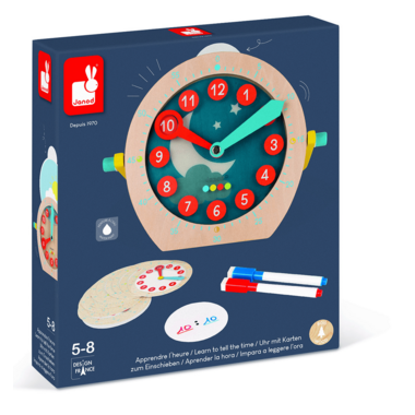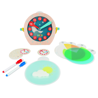 This wooden clock is ideal for learning to tell the time in a fun way, and allows children from 5 years old to learn at their own pace while having fun! To learn how to tell time, this educational toy comes with many accessories: 13 model cards with a digital format on one side and an analogue format on the other, 1 neutral model card that can be erased to write other combinations using the 2 markers provided, 6 cards to slide into the slot of the clock: day/night and 4 cards to better visualize the notions of 15-30-45 and 60 minutes. The neutral model card will allow you to create new combinations as the child progresses! Practical and well thought out, a carrying handle makes it easy to carry the clock and it tilts backwards for greater stability. To familiarize with the concept of time or to consolidate the knowledge acquired in class, this is a beautiful and fun toy.