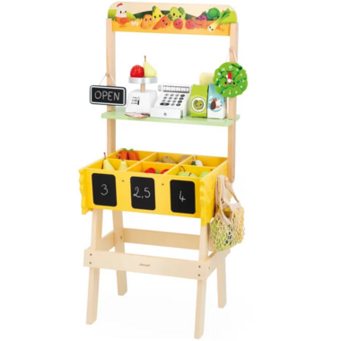 The small producers' market is open! Their wooden Farm Market is the ideal toy for children aged 3 years and up who'll love pretending to run their own business. This beautiful pretend play toy is equipped with numerous accessories for an enriching and realistic play experience. A total of 58 accessories complete this children's market.