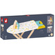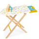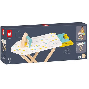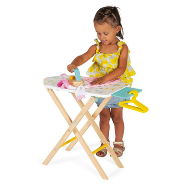 The pile of laundry keeps growing! Quick - get the ironing board! This beautiful little wooden ironing board is perfect for smoothing out dolls clothes. It's designed to let children aged 3 to 8 pretend they're helping grown-ups with their household chores. The height of the table is adjustable to suit your child (49.5 to 55.5 cm) and can be folded away for easy storage. There's a sliding shelf on the outside of the table - you can put the iron on the shelf while you fold the little clothes. The feet of this toy show off some beautiful natural wood, while the board is adorned with pretty grey, green and yellow motifs.