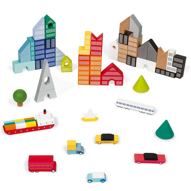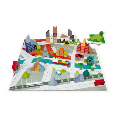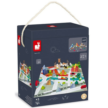 Calling all aspiring architects! It’s time to bring the world’s coolest city to life - yours! With this 2-in-1 game made of wood and cardboard, it’s easy to build your own little world, full of cars and trains! Once you’ve put the 20-piece city puzzle together it doubles as a play mat (60 x 60 cm). Children can then arrange the 60 blocks representing buildings and vehicles any way they like. The game pieces are made of solid wood and painted using water-based paint. They open up a huge range of possibilities for aspiring designers: cities, towers, landscapes - you name it, you can build it! The practical barrel is great for storing the pieces, and it can be easily transported using its handle. This game is perfect for developing hand/eye coordination and spatial awareness. Perfect for children aged 3 and over.