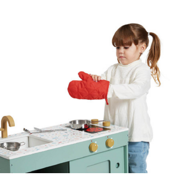 A loft version of a children's kitchen, what an original concept! Like a central island, this magnificent toy kitchen in olive green tones will take pride of place in the children's bedroom or in the living room for hours of cooking fun! With this wooden kitchen, get ready to enjoy the most divine dishes. Children from the age of 3 will be able to imagine they are chefs thanks to the different equipment on offer: a sink and tap, a printed hob, four rotating sound buttons and two sliding doors for the oven and the cupboard. Inside, a shelf means you can store the 7 metal accessories (spatula, pasta spoon, ladle, slotted spoon, colander, saucepan, frying pan) and the fabric glove provided. The soft, natural colour of the furniture matches perfectly with the patterned white Terrazzo worktop, which enhances the whole with its bursts of colour. The echo of certain ochre elements from the cooker is perfect! Robust and stylish, this children's kitchen is super practical and allows them to have fun, imagine and create in ideal conditions.