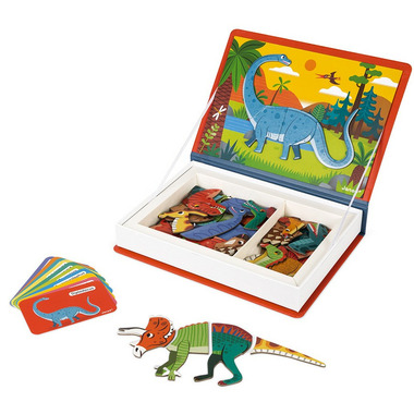 Have you discovered Magneti'books yet? These portable, educational magnetic books are loved by young and old alike! So, how do they work? This magnetic box includes a host of different magnetic items for kids to put together, according to the templates or any way they like! This cardboard game will transport children aged 3 and over to the realm of the dinosaurs with 40 magnetic pieces and 10 cards, each of which shows a dinosaurs Latin name. Once the book is open, the aim is to put together a picture of the dinosaur shown on the card using the magnets provided. All the magnetic pieces are completely interchangeable, so kids can have hours of fun coming up with beasts even bigger and scarier than the real dinosaurs! Helps children develop their imagination and fine motor skills.