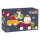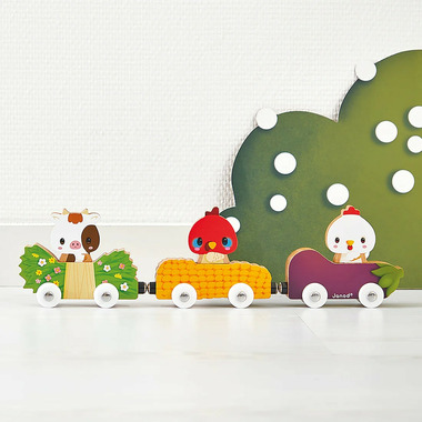 This magnetic toy consists of 3 cars (aubergine, corn and wildflowers) and 3 wooden characters (chicken, turkey and cow). Baby can work on their logic by pairing each animal with their favourite food, or by seating them in the car of their choice: they are all interchangeable! When our farm friends aren't in the mood for competition, they can go for a ride in unison, attached just like train carriages, one behind the other via the magnets.