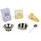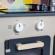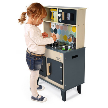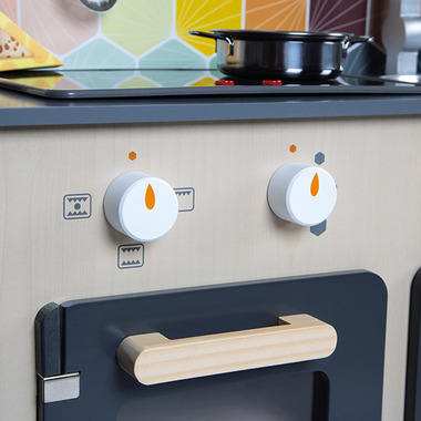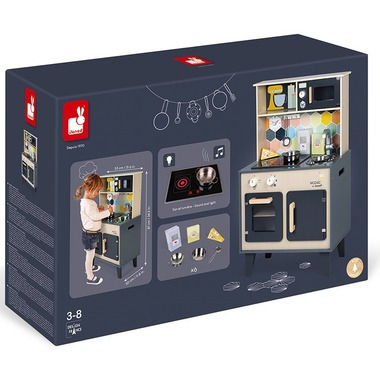 Just like a real kitchen, it is equipped with an induction nob featuring LED lights and real sound effects. Just press the red buttons once to turn the plates on, then a second time to hear the sound of the water boiling in the pan. The sound and induction nobs turn off automatically after 30 seconds, or when you press the red buttons a third time. This beautifully designed, fully equipped kitchen also includes an oven, microwave, cupboard, 3 rotary knobs with sound effects, a stainless-steel sink and a clock.