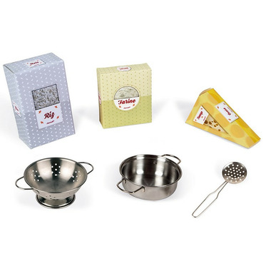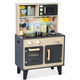 Here's a children's kitchen set with some real character! Its beautiful combination of natural wood, black paint and coloured mosaics give the whole thing a really classy look. Kids creating in a kitchen like this are bound to come up with some groundbreaking recipes! So give their imaginations free reign and see how far some inspiration from mum and dad can take them! The large, all-wood mosaic kitchen comes with hooks for hanging up 1 slotted spoon, 1 pan, 1 metal colander, and 3 boxes of cardboard food (cheese, flour, rice).