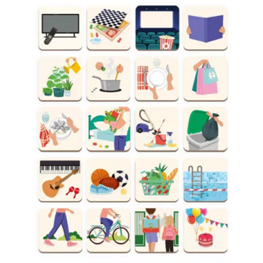 - The set is composed of 5 animals present in 11 copies each, 7 stickers in 6 languages for the days of the week and 20 activity magnets ranging from simple household chores, to leisure, including sport, music and birthdays, not to mention the end of school.