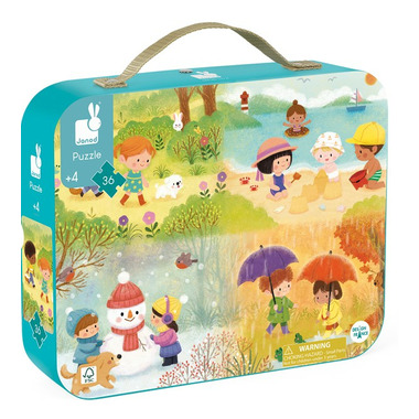 Spring Summer Autumn Winter ! Explore the 4 seasons with this beautifully detailed 36-piece cardboard puzzle. Your child will develop memory and dexterity with this beautiful 36-piece cardboard puzzle. In its pretty case, this puzzle will be easy to transport thanks to its fabric handle. Contains a poster serving as a model for beginners, the more seasoned can then complete the puzzle independently.