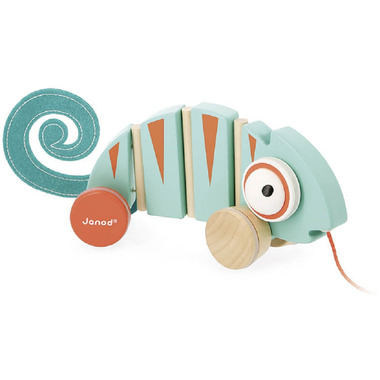 Ready for a walk in the tropics? Baby can go on an adventure by walking with this sweet wooden pull-along chameleon. With its rolling eyes and articulated body, this pull-along toy undulates as it rolls along!
