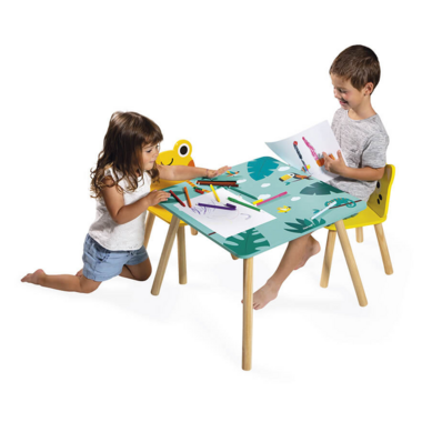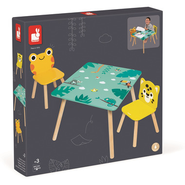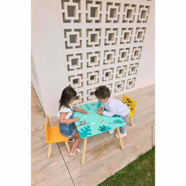A moment of relaxation in the heart of the tropical forest! This piece of furniture, made up of a colorful table and 2 chairs representing a frog and a jaguar, will fit perfectly into your living room or your child's bedroom. This set will accompany your child during quiet moments for a read or to spend a few hours playing and drawing. Water color. This furniture is adapted to the size of children from 3 years old. To create this range we headed for the tropics in search of escape, exoticism and contrast . To best illustrate this wild nature, we have brought together joyful animals with vitamin colors and plant elements with soothing hues.