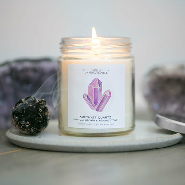 The JaxKelly Amethyst Crystal Candle is hand-poured and made with 100% American farmed soy wax. Hidden inside is a tumbled Amethyst Quartz crystal that enhances wellness, healing, & spiritual growth. Once your candle has burned retrieve your crystal and carry it with you, or place it in a special space to balance and heal your energy.
