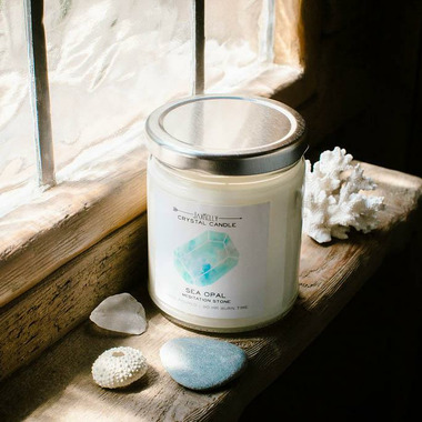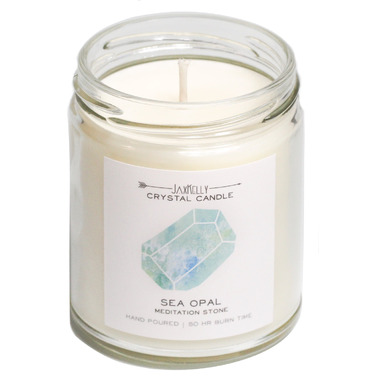 The JaxKelly Sea Opal Crystal Candle is hand-poured and made with 100% American farmed soy wax. Hidden inside is a Sea Opal crystal that helps center your mind and raise your vibrations. Once your candle has burned, retrieve your crystal and carry it with you, or place it in a special space to help manifest peaceful energy for your mind, body, and soul.