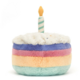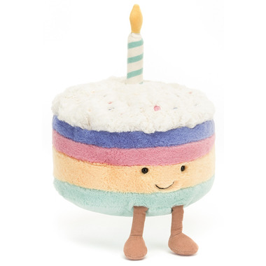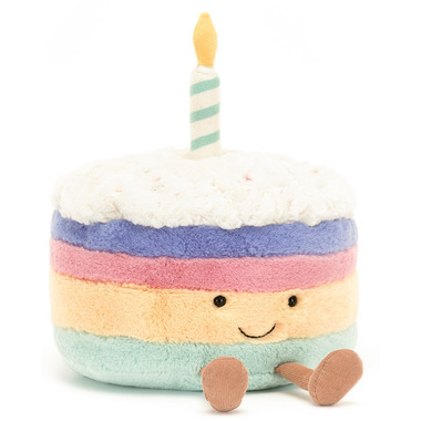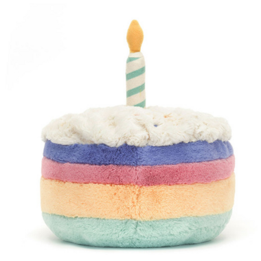 Celebrate in colour with Amuseable Rainbow Birthday Cake! This joyful cake has four soft layers in pink, purple, yellow and green, fluffy icing with chocolate flecks and a suedette stripe candle with a golden fur flame. Kick up those cord boots and dance!