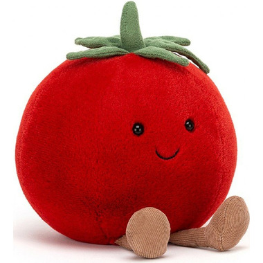 Amuseable Tomato is one sun-ripened rogue! Rosy and plump as a cricket ball, topped with a scruffly, leafy cap, this bright red bounder in toffee cord booties is equally at home in the kitchen or the garden. Anywhere where there's sunlight, in fact!