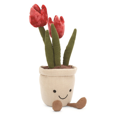 Amuseable Tulip lights up the room with a dazzling smile and dizzy Dutch style. This blushing blossom has a linen pot in neutral beige with cordy feet and stalks to match, fuzzy soil and rich red velvety flowers!