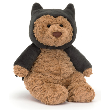 Bartholomew Bear Bat is the hero we need this Halloween! This tufty golden bear wears a bat-ear hood with fuzzy sleeves to stay cosy on the rooftops! His slate cape is embroidered and lined, and comes off for a full transformation!