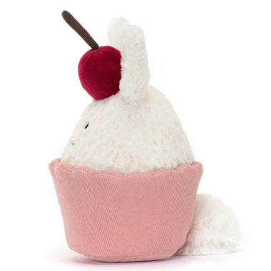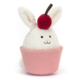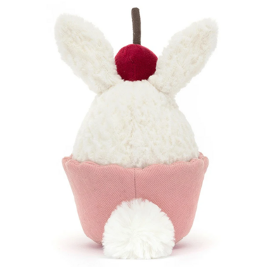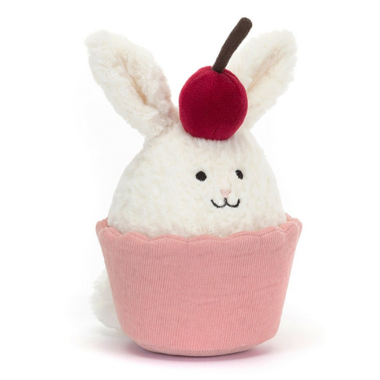 The Dainty Dessert Bunny Cupcake is gorgeously mixed-up. Inside that pink fine cord cake case there's a soft cream bunny masquerading as a treat! This long-eared bunny has textured fur and wears a bold cherry hat. There's even a bobtail peeping out! A cute gift with kawaii charm.
