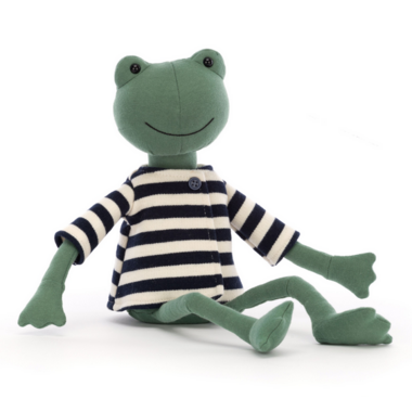 Stylish in stripes and loveably lanky, Francisco Frog loves to sit by the river! Jumbly-joyful, with long, loping legs, this bobble-eyed buddy is such a swell swimmer! Take Francisco's flipper and this green guide will show you the best spots to feed the ducks!