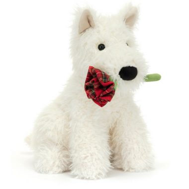 Munro Scottie Dog has a special delivery! This shaggy cream pup has a black suedette nose, and is holding on tight to a red tartan rose, with a soft green stem. Munro promises to love you until the last petal falls!