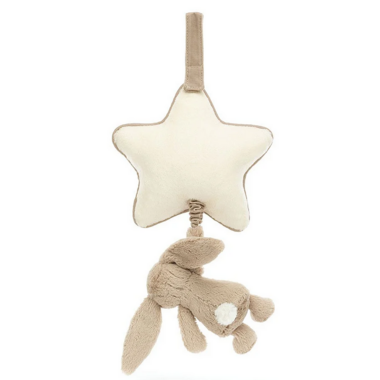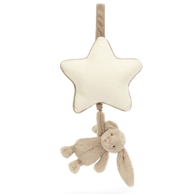 An enchanting newborn gift, let babies dream sweetly with a Bashful Beige Bunny Musical Pull. The most loved Bashful Bunny, in soft, mushroom coloured fur made from recycled fibres can be gently pulled to hear an original Jellycat lullaby. The cream star shaped musical pull with contrast trim can be attached to a crib or pram with a hook and loop closure fastening.