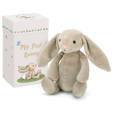 Make a first birthday bounce with My First Bunny. Tucked up snugly in a bunny-print box, this flopsy friend is ready for the world! Velvety-soft in scrummy beige fur, this little bunny is sneezy-tot-friendly. The perfect memento for a very special day.