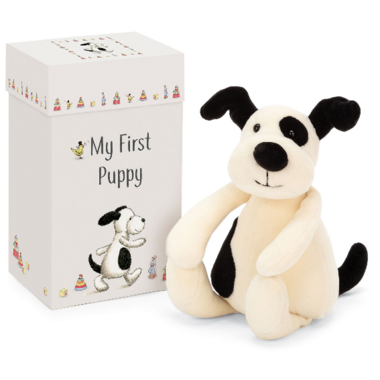 My First Puppy is a scrumptious present to welcome home a new baby. Open up this charming printed box to meet a cuddly cream and black puppy! Supersoft, with adorable patches, this perky pup is a newborn's best friend. No walkies required - just plenty of hugs.