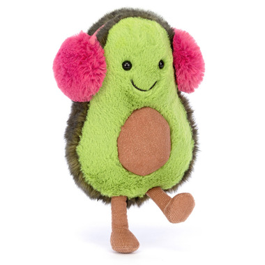 The Jellycat Toastie Amuseable Avocado is keeping warm this winter in a pair of fuzzy ear muffs!