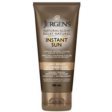 Get foolproof, natural-looking colour fast with Jergens Natural Glow Instant Sun Sunless Tanning Moisturizer + Bronzer — uniquely works with your skin tone to mimic results from the sun while providing hydration for skin that feels soft. Spreads sun-kissed colour evenly and lasts for days, it instantly delivers bronzy, natural-looking colour while continuing to develop into a deeper, flawless tan within hours — no orange tones, streaks, or blotches. Infused with nourishing coconut oil, vitamin E, and tinted bronzers, this moisturizing self-tanning formula smooths dry, rough skin for hydration that lasts all day. Quickly absorbs into your skin without feeling sticky or greasy, this tanning moisturizer is paraben-free, dermatologist-tested, and cruelty-free — your skin will thank you. Available in Light Bronze and Deep Bronze shades to help you instantly create your ideal colour. 180 mL size.