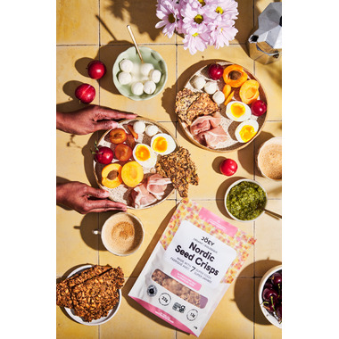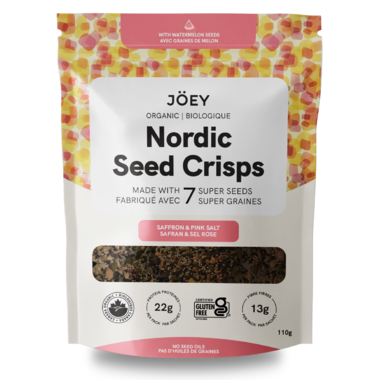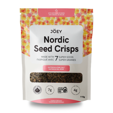 Joey Nordic Seed Crisps made with 7 super seeds Saffron & Pink Salt. You can snack on these crisps on their own, pair with soup or cheese, sprinkle on salad, or include them in your charcuterie board.