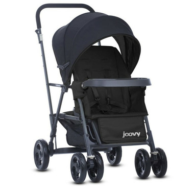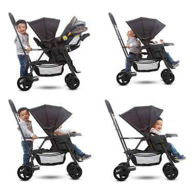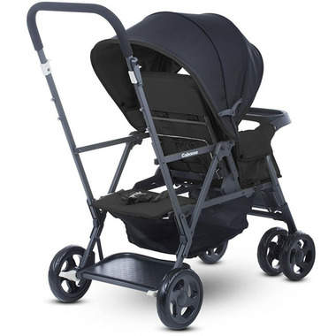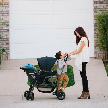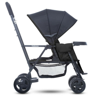 Tandem mobility for a growing toddler and a new little one. A graphite-coloured steel frame has a new lean profile and makes strolling with two kids a breeze. The versatile Caboose Stand-On Tandem allows an older child to sit and stand on its patented rear platform/seat while a younger child rides comfortably in front. If the standing child tires, they can turn around and rest on the padded rear seat. Fully equipped with a universal car seat attachment system, the Caboose can accommodate an infant car seat, so you can use it as soon as your new arrival comes. And parents make out too because the Caboose is lightweight and folds up compactly. It also has a large basket and storage pockets for everything you'll need to take along with you, and the rear platform means no more lifting a heavier older child in and out of the stroller when they want to see or get tired. The Caboose Stand-On Tandem double stroller makes strolling two children a breeze!