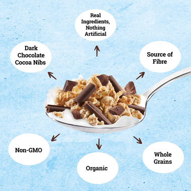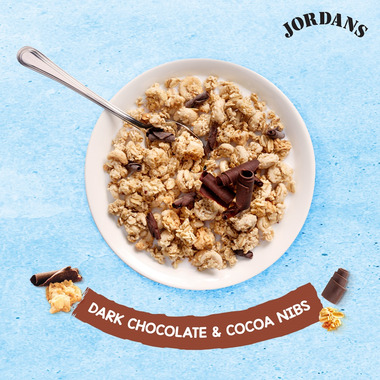 Jordans organic granola with dark chocolate curls and cocoa nibs. These granola clusters are made with remarkable, real ingredients that provide an exquisite flavour and a light, crispy crunch. Try something new and use these organic Dark chocolate & Cocoa Nibs granola cluster cereal on ice cream, in smoothie bowls and for snacking.