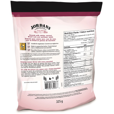 Jordans Organic Morning Granola Crunchy Coconut and Raisin, granola with raisins, coconut, Brazil nuts and sunflower seeds real ingredients, nothing artificial.
