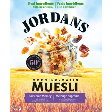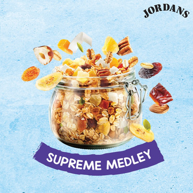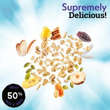 Supreme Medley muesli with dried fruit, pumpkin seeds, and nuts. This muesli is crafted with a lighter touch, so you taste only the abundance and variety of real ingredients in a delightful harmony of taste and texture. Enjoy Supreme Medley muesli not only for breakfast, but in smoothie bowls, with chia pudding and for snacking.