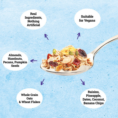 Barley flakes, Raisins, Whole grain wheat flakes, Whole grain oat flakes, Sultanas, Whole grain toasted wheat flakes, Sweetened dried diced pineapple (pineapple, cane sugar, citric acid, sulphites), Chopped dates, Coconut chips, Sweetened dried diced papaya (papaya, cane sugar, sulphites), Pumpkin seeds, Dried banana chips (banana, coconut oil, cane sugar, flavour), Whole almonds, Whole roasted hazelnuts, Chopped pecans.