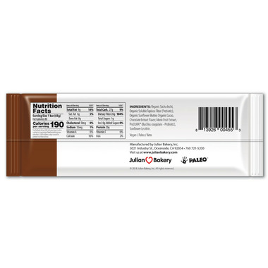 After two years in development Julian Bakery is so proud to launch the first (non-gritty), gluten free, soy free, Vegan & Paleo, Pegan® Protein Bar that is made with 98% Organic Ingredients. This delicious protein bar is soft, creamy, delicious, rich chocolate tasting bar has just the right amount of sweetness to truly satisfy your hunger and that sweet tooth at the same time.