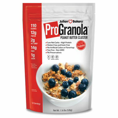 Julian Bakery ProGranola Peanut Butter Cluster Paleo Cereal is an amazing Vegetarian and Paleo high protein Paleo cereal puts the crunch back in your food plan without setting you back. Finally a granola that is keto, soy free, gluten free, grain free, low carb, and delicious. Their carefully formulated high protein granola was specifically formulated to be Paleo & IKDiet compliant and contains 12g egg white protein per serving and curbs appetite with organic prebiotic fiber.