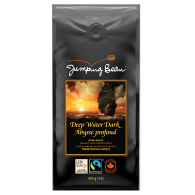 Deep Water Dark is Jumping Bean's signature blend of darkly roasted Fair Trade Organic coffee, Its rich body and very distinctive spicy bouquet. Create a unique, smooth flavour that is a dark coffee lovers.