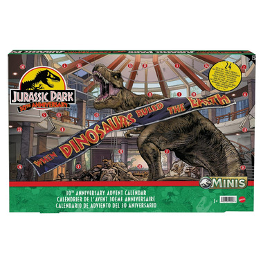 This Advent Calendar celebrates Jurassic World Rebirth and brings a 24-day December countdown of surprises. The total holiday haul includes 18 mini dinosaur toys and 4 environment pieces for creating a mini Jurassic World adventure at home! Each surprise is hidden behind a numbered perforated door, ready for eager fingers to rip open. The largest dinosaur is provided in 3 pieces that snap together, for a 3-day buildup of anticipation! The package features scenes from Jurassic World Rebirth. A must-have December activity for dinosaur fans 3 years and older.