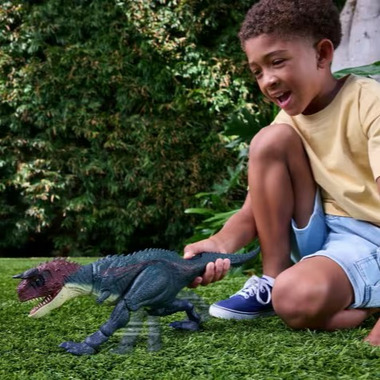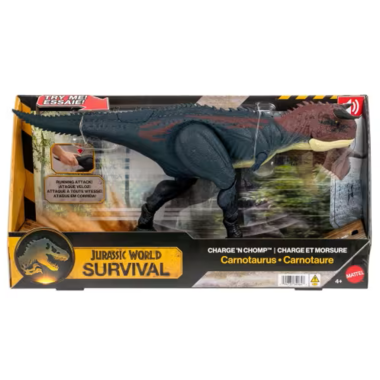 The Jurassic World Charge 'N Chomp Carnotaurus dinosaur toy has a thrilling running and chomping motion as well as roar sounds. The multi-jointed legs move in a realistic charging run, activated by a button at the base of the tail. The running pounce sets it on offense and the chomps provide defense. This multi-featured dinosaur toy is ready for battling fun. Scan the Tracking Code on the dinosaur's foot in the free Jurassic World Play App with a compatible smart device (Android or iOS, not included) to unlock a digital version of the dinosaur and play the fiercely fun game to race vehicles on land, air and sea. Suitable for dinosaur fans ages 4 years and up. Multiple species are available, each sold separately, subject to availability. Colors and decorations may vary.