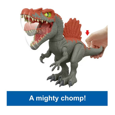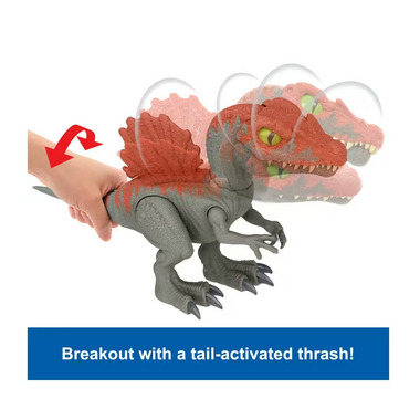 • BREAKOUT! Move the tail of the spectacular Spinosaurus side to side to help it crash out of the box with its thrashing action. Push the button on top for an aggressive dino chomp!