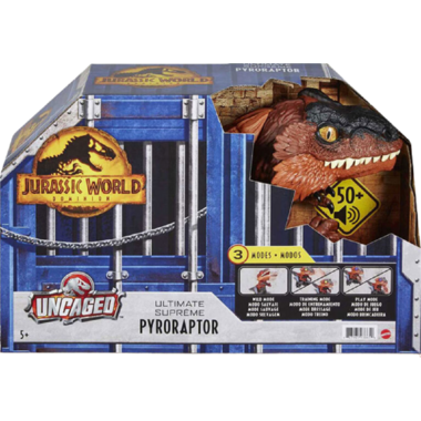 Get ready for action and adventure with Jurassic World Dominion. This Ultimate Pyroraptor figure, based on the species introduced in the movie, has been uncaged so fans can experience the excitement of human and dinosaur interaction. This toy includes a wide attacking jaw, rotating body, and raising and lowering tail, not to mention animated eyebrows and feathers standing up at attention.